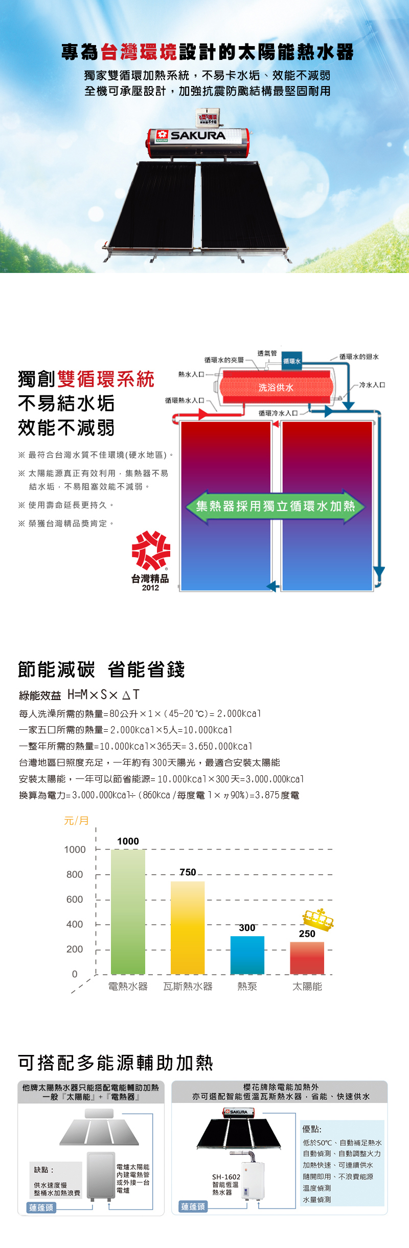 太陽能熱水器 首頁 器具品牌 櫻花牌 熱水器 太陽能熱水器 太陽能熱水器 產品特色 產品規格 產品功能 型號 SE-3002LS 儲水桶 容量 300公升 材質 內外桶不鏽鋼304 集熱器 面積 3.88m2 形式 不鏽鋼平板式 電源 220V 輔助電熱功率 4 kW (18A) 整機組裝後尺寸(儲水桶+集熱器+固定架) 長x寬x高(mm) 2560x2110x1450 可搭配加壓馬達 可 微電腦輔助加熱 有 參考使用人數 4~6人 雙循環設計,不易結水垢 強化玻璃面板,耐壓耐用 可搭配多能源輔助加熱 採用厚桶耐久耐壓 防颱抗震設計適合台灣 榮獲台灣精品獎