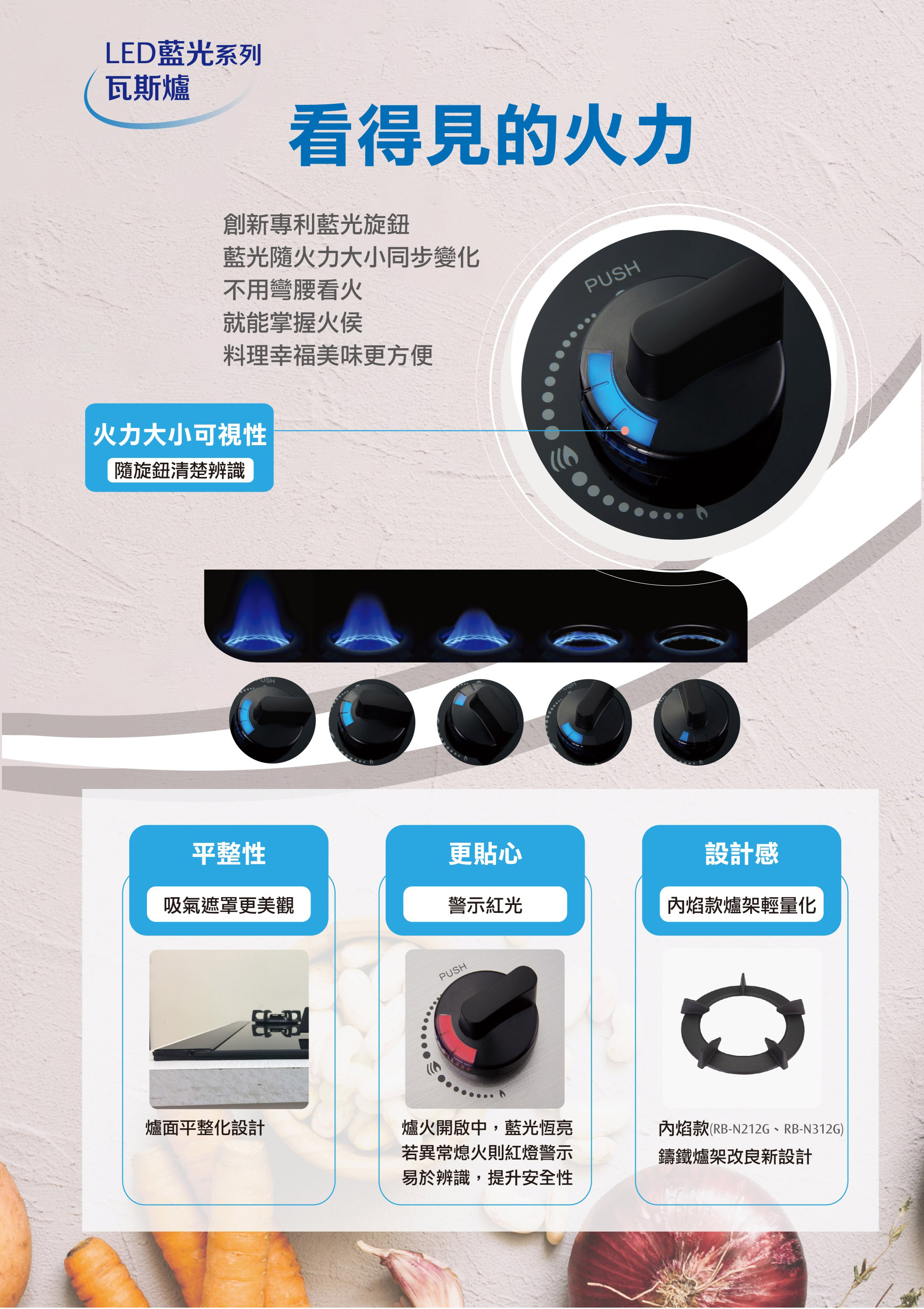 LED旋鈕系列 首頁 器具品牌 林內牌 瓦斯爐 LED旋鈕系列 創新藍光專利旋鈕 藍光隨火力大小同步變化 火力大小可目視化 改良式吸氣遮罩,爐面平整更美觀 警示紅光設計,異常熄火紅燈顯示,提升安全性 鑄鐵爐架輕量化改良設計 日本專利內焰爐頭 不銹鋼雙層湯盤 火焰集中,高保溫性與保水性 一級能效,省能高熱效 產品介紹 產品規格 安裝說明 外觀尺寸 mm W×H×D 860×143×466 挖孔尺寸 mm W×D 815×405(R0) 天板材質 黑色強化玻璃 點火方式 電子連續點火 使用電源 DC 1.5V 瓦斯消耗量 kW 9.6 標示熱效率 52% 能效分級 1級
