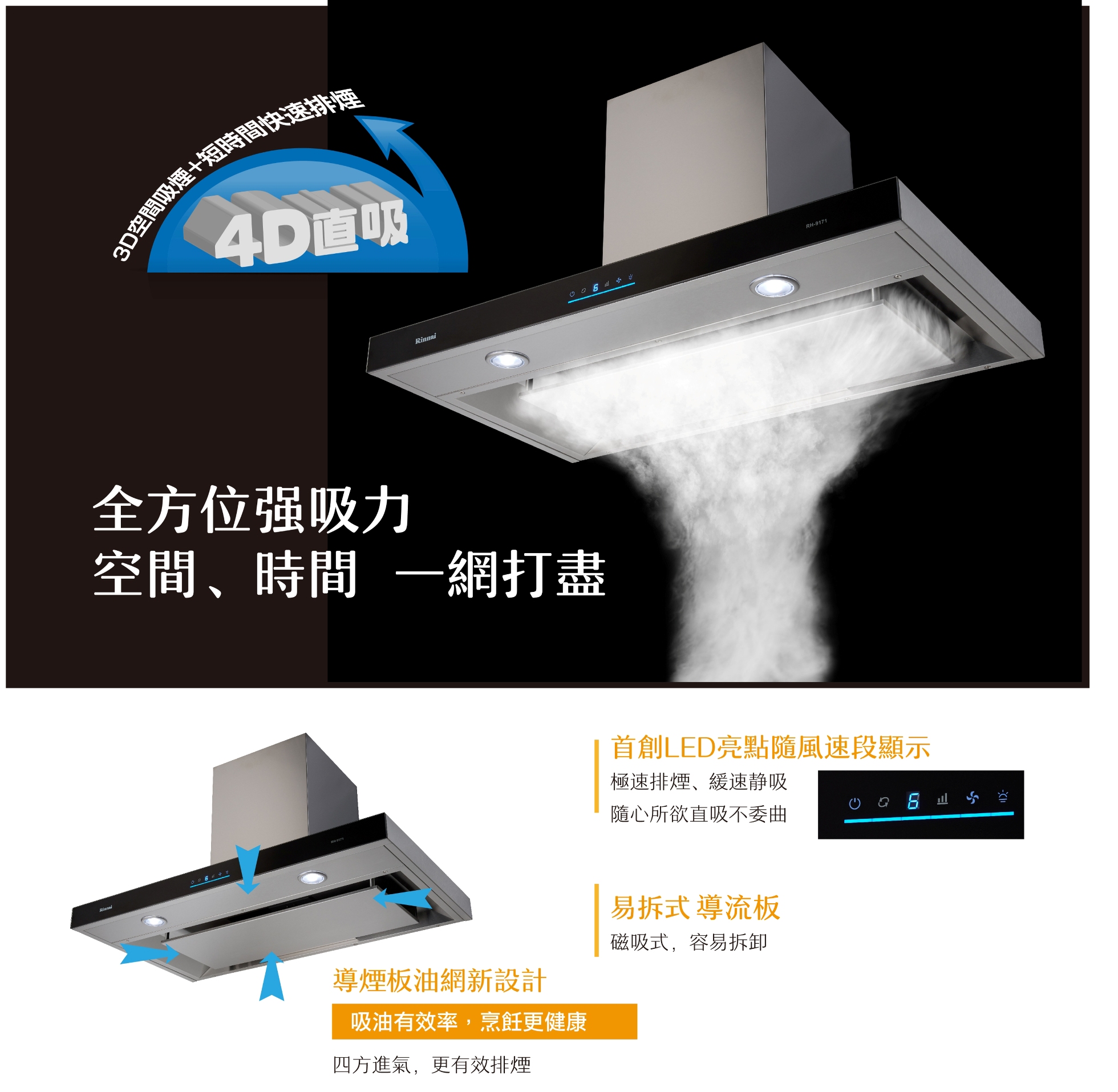 倒T式排油煙機 首頁 器具品牌 林內牌 除油煙機 倒T式排油煙機 4D直吸:3D空間+短時間快速排煙 首創LED亮點隨風速段顯示 易拆式磁吸導流板 隱藏式油杯 導流板油網新設計 四方進氣,有效排煙 不銹鋼機體,耐用高質感 六段風速 延遲90秒自動關機 低速空氣清新快捷鍵 產品介紹 產品規格 安裝說明 外觀尺寸 mm W×H×D 898×501-930×520 使用電源 110V/60Hz 消耗電功率W 306 材質 SUS#430 最大排風量m3/min 22