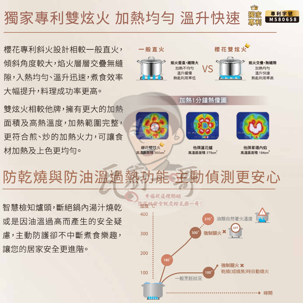 - 防乾燒偵測與油溫過高保護裝置,自動關火最安心