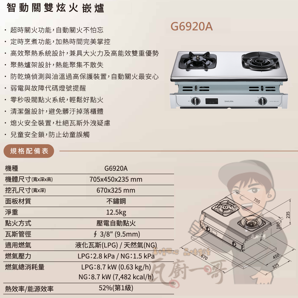LPG共8.7kW (0.63 kg/h)/NG共8.7kW (7,482 kcal/h)