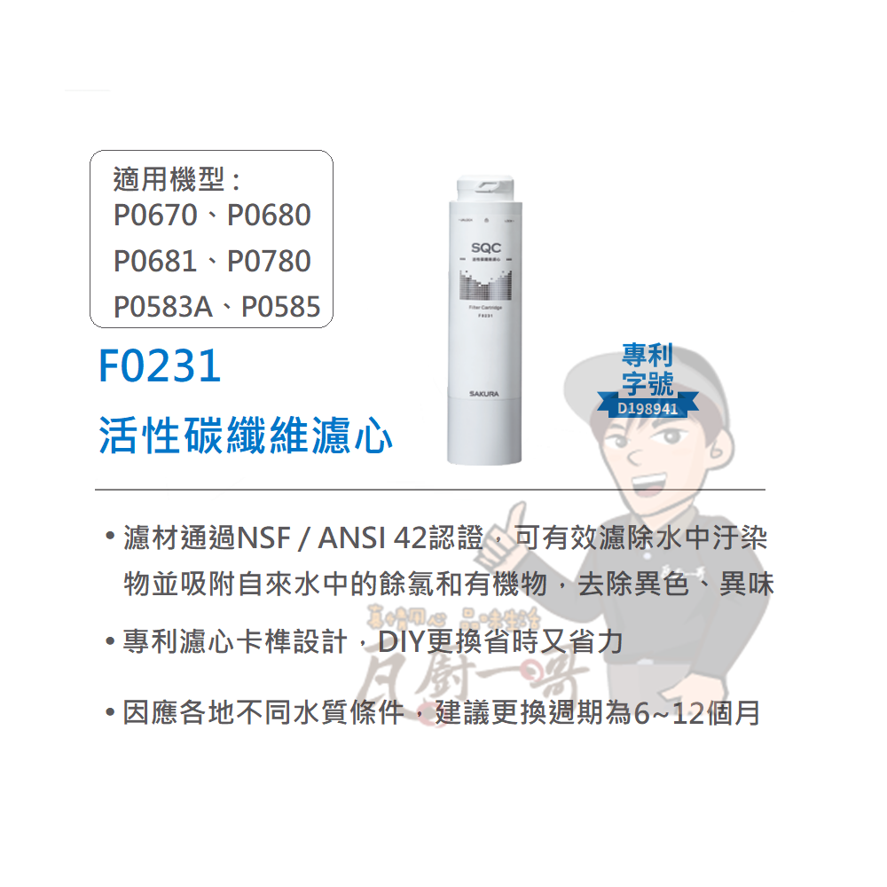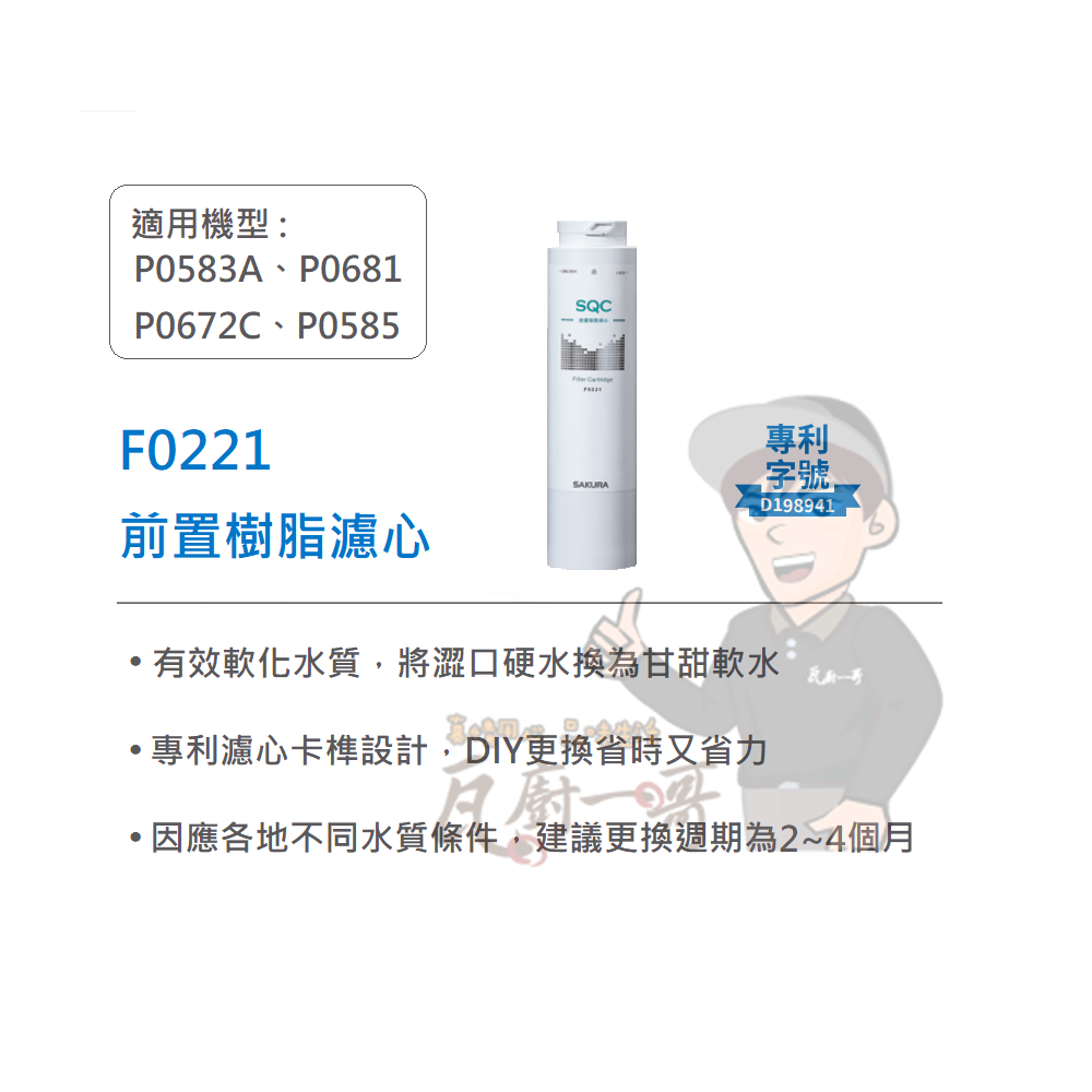 ㊣ P0583A / P0585 雙溫淨熱飲專用濾心組㊣ 首頁 器具品牌 櫻花牌 淨水設備 濾心 ㊣ P0583A / P0585 雙溫淨熱飲專用濾心組㊣ P0583A / P0585 雙溫淨熱飲專用濾心組 有效軟化水質,降低水垢生成 有效濾除餘氯、異色異味 有效濾除重金屬、有害微生物 專利濾心卡榫設計,方便DIY更換 $ 5,040 $ 5,600 濾心介紹 濾心規格 第一道-F0221 X4 成分:氫鈉樹脂 功用:有效置換鈣鎂離子,軟化水質 ※因應各地不同水質條件,建議更換週期為2~4個月。 第二道- F0231 X 1 成份:活性碳纖維 功用:有效濾除水中污染物、重金屬與有害微生物;並有效吸附水中異味、去除餘氯 ※因應各地不同水質條件,建議更換週期為6~12個月。