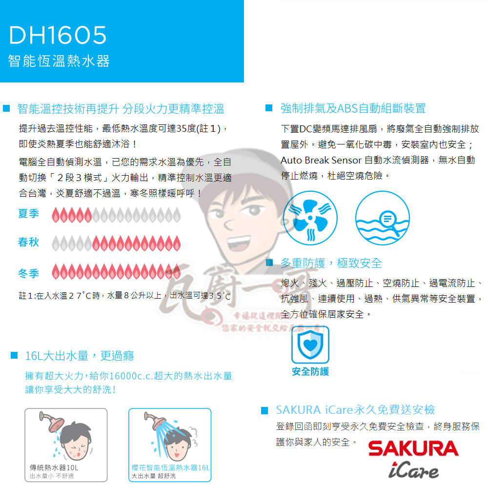 - 16L智能恆溫,穩定供給熱水,不會忽冷忽熱