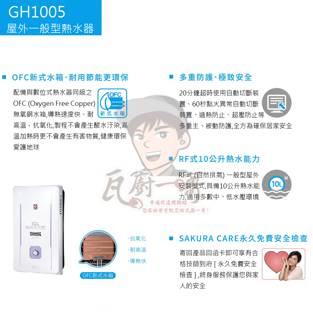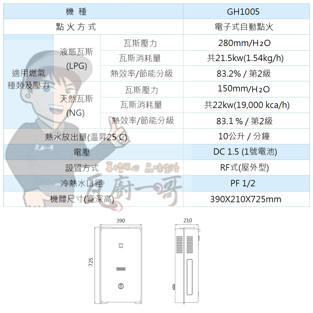 GH1005 10L 屋外型熱水器 首頁 器具品牌 櫻花牌 熱水器 瓦斯熱水器 屋外型傳統熱水器 GH1005 10L 屋外型熱水器 GH1005 ▪ 櫻花熱水器+永久免費送安檢=真正的熱水器 ▪ OFC新式水箱,耐用節能更環保 ▪ 10L熱水供應能力 ▷建議售價: 7,600 ▷優惠價格: 6,840 產品功能 產品規格 特色說明 櫻花熱水器+永久免費送安檢=真正的熱水器 OFC新式水箱,耐用節能更環保 10L熱水供應能力 熱水放出量(溫升25℃) 10L/min 安裝適用環境 屋外式自然排氣 點火方式 全自動電子點火 冷熱水管口徑 PF 1/2 尺寸(直徑x高) 390 x 260×725 mm 機體重量(kg) 14 能源效率等級 2級 熱效率 液化瓦斯:83.2% / 天然瓦斯:83.1% 電源電壓及頻率 AC110V / 60Hz