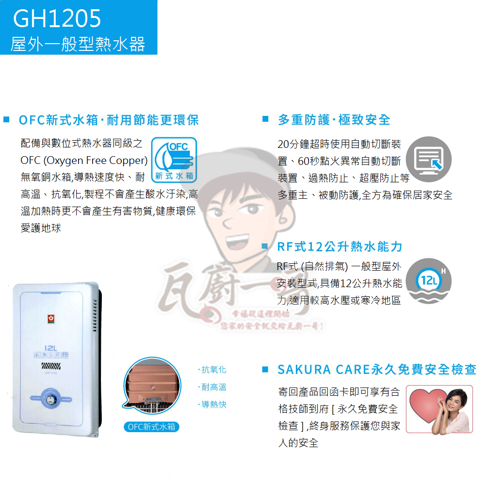 GH1205 12L 屋外型熱水器 首頁 器具品牌 櫻花牌 熱水器 瓦斯熱水器 屋外型傳統熱水器 GH1205 12L 屋外型熱水器 GH1205 ▪ 櫻花熱水器+永久免費送安檢=真正的熱水器 ▪ OFC新式水箱,耐用節能更環保 ▪ 12L熱水供應能力 ▷建議售價: 9,000 ▷優惠價格: 8,100 產品功能 產品規格 特色說明 櫻花熱水器+永久免費送安檢=真正的熱水器 OFC新式水箱,耐用節能更環保 12L熱水供應能力 熱水放出量(溫升25℃) 12L/min 安裝適用環境 屋外式自然排氣 點火方式 全自動電子點火 冷熱水管口徑 PF 1/2 尺寸(直徑x高) 390 x 260×725 mm 機體重量(kg) 14 能源效率等級 2級 熱效率 液化瓦斯:83.1% / 天然瓦斯:83.0% 電源電壓及頻率 AC110V / 60Hz
