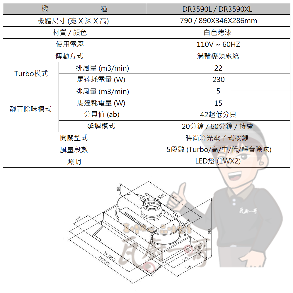 DR3590A 全隱藏型除油煙機 - 渦輪變頻系列
