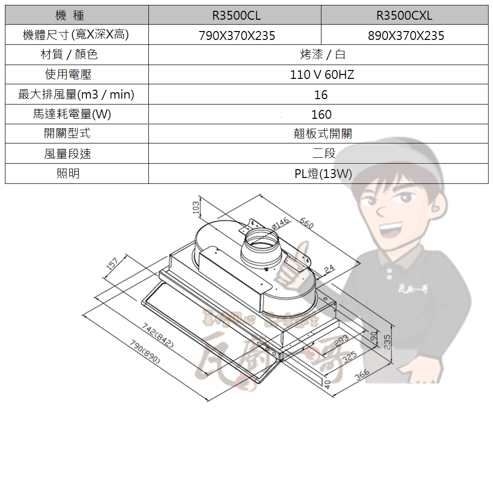 R3500DL : 790x366x286 mm