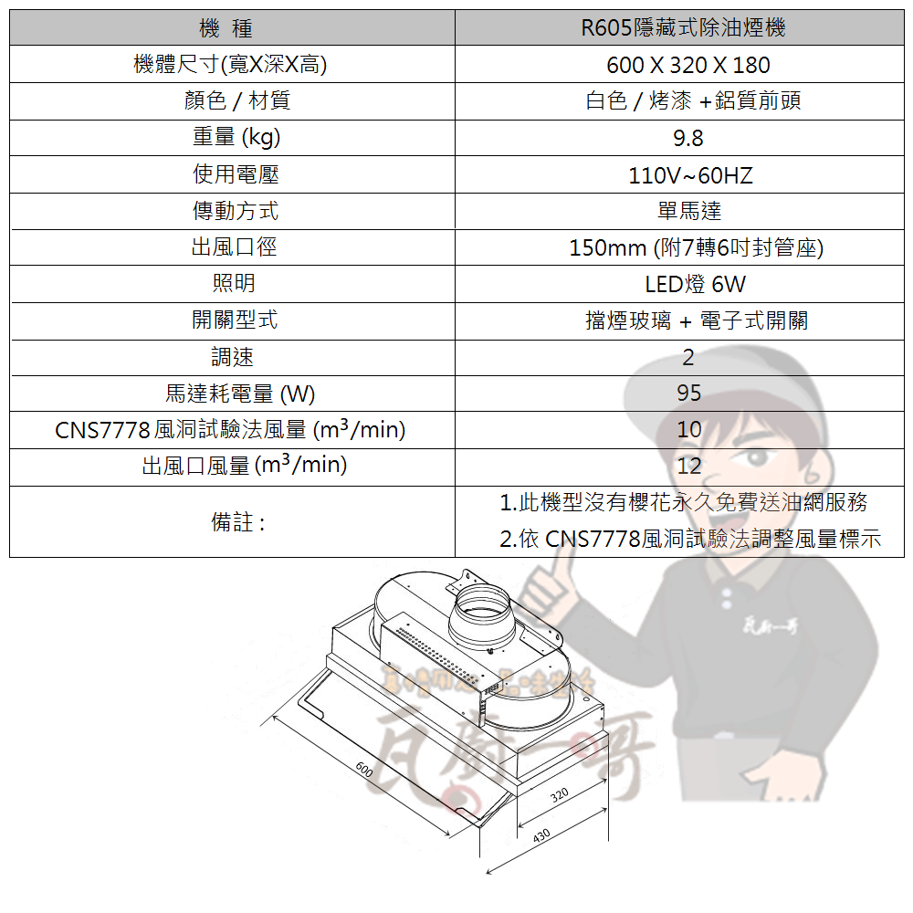 R605 輕巧型除油煙機(半/全隱藏式) - 小宅系列