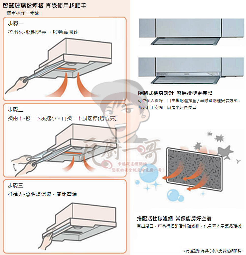雙用安裝設計,隨心搭配廚櫃抽拉式自動啟動擋煙版,隨開隨關