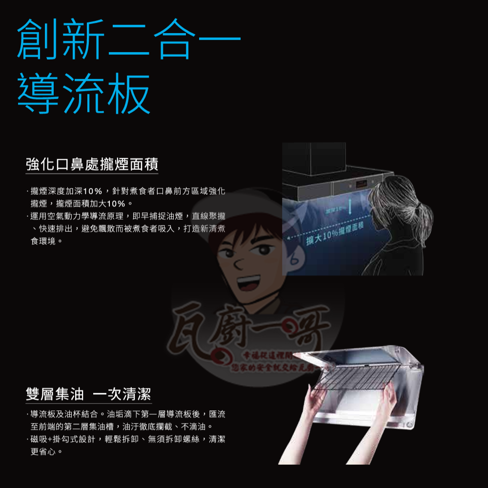 - 新進化二合一形導流板,強力捕捉主力油煙區,創造健康煮食環境