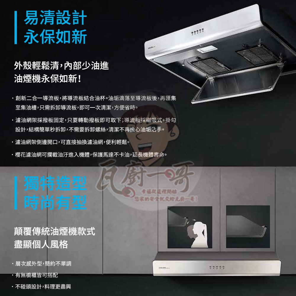 - 創新二合一導流板,雙層集油、一次清潔