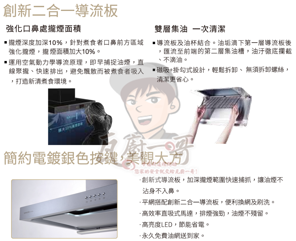 - 新進化二合一形導流板,強力捕捉主力油煙區,創造健康煮食環境