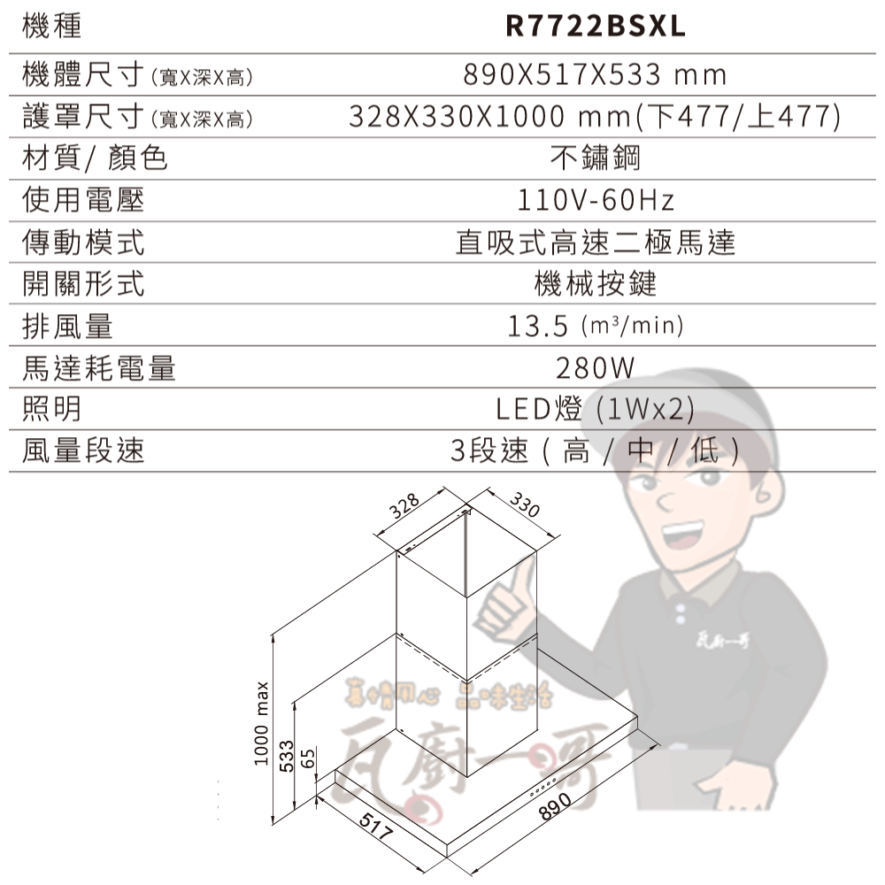 - 高效率直吸式高速二極馬達,排煙強勁、油煙不殘留