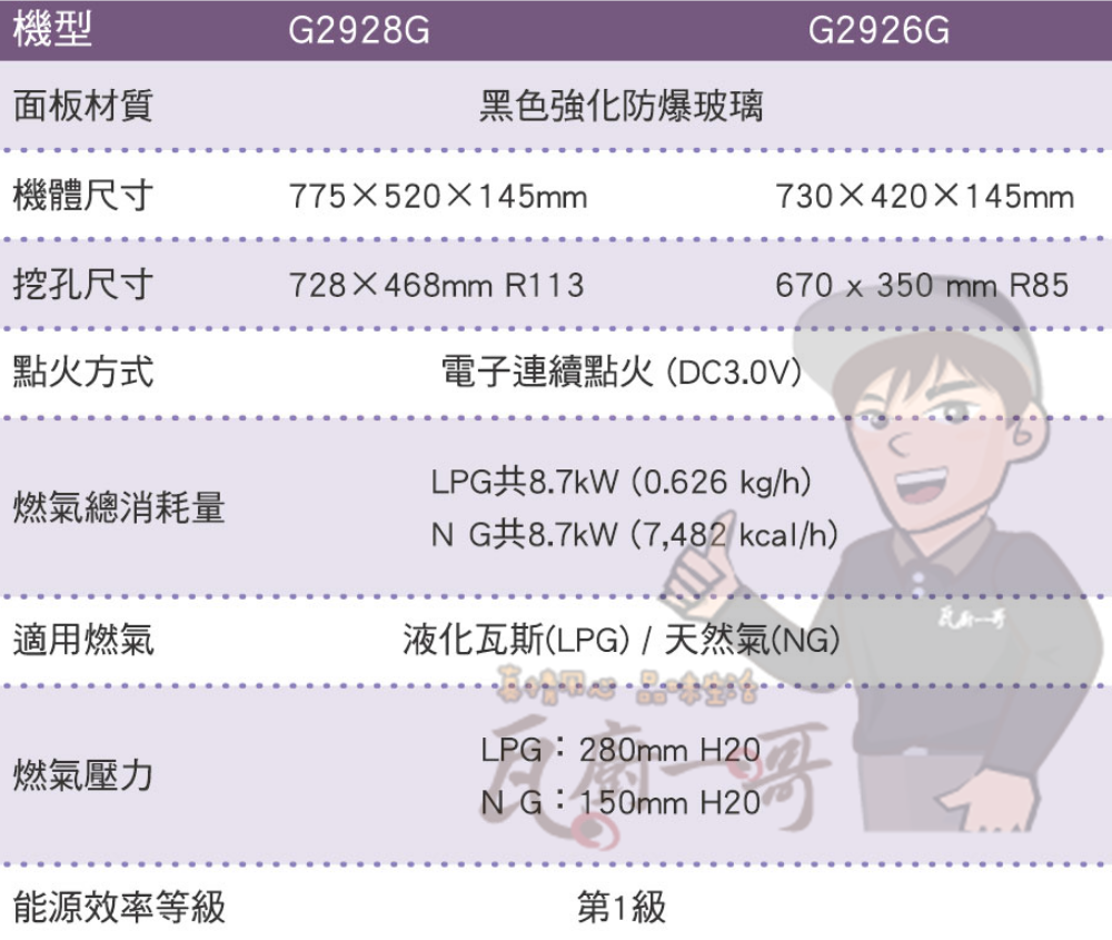 LPG共8.7kW (0.63 kg/h)/NG共8.7kW (7,482 kcal/h)