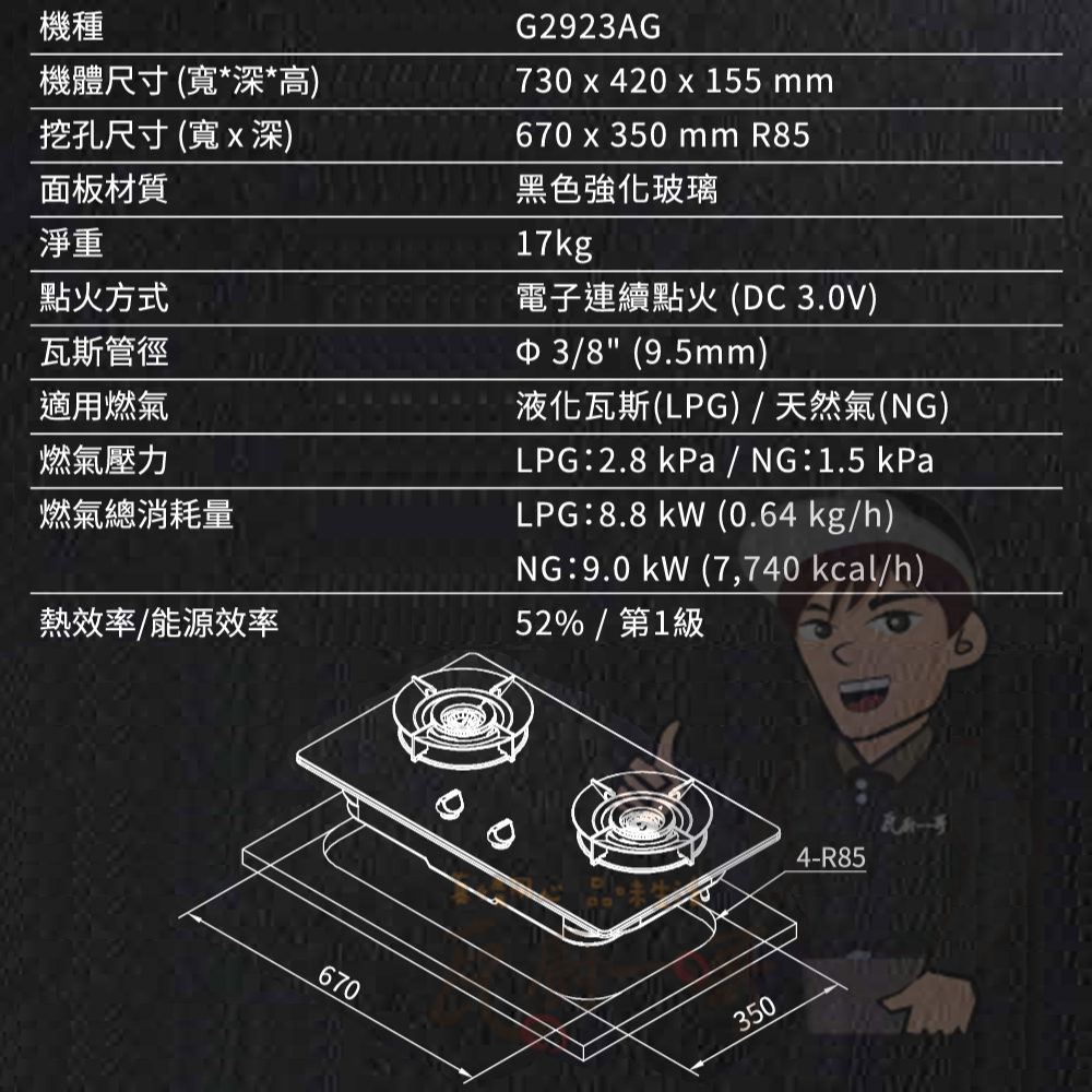 LPG共8.8kW (0.63 kg/h) / NG共9.0kW (7,740 kcal/h)