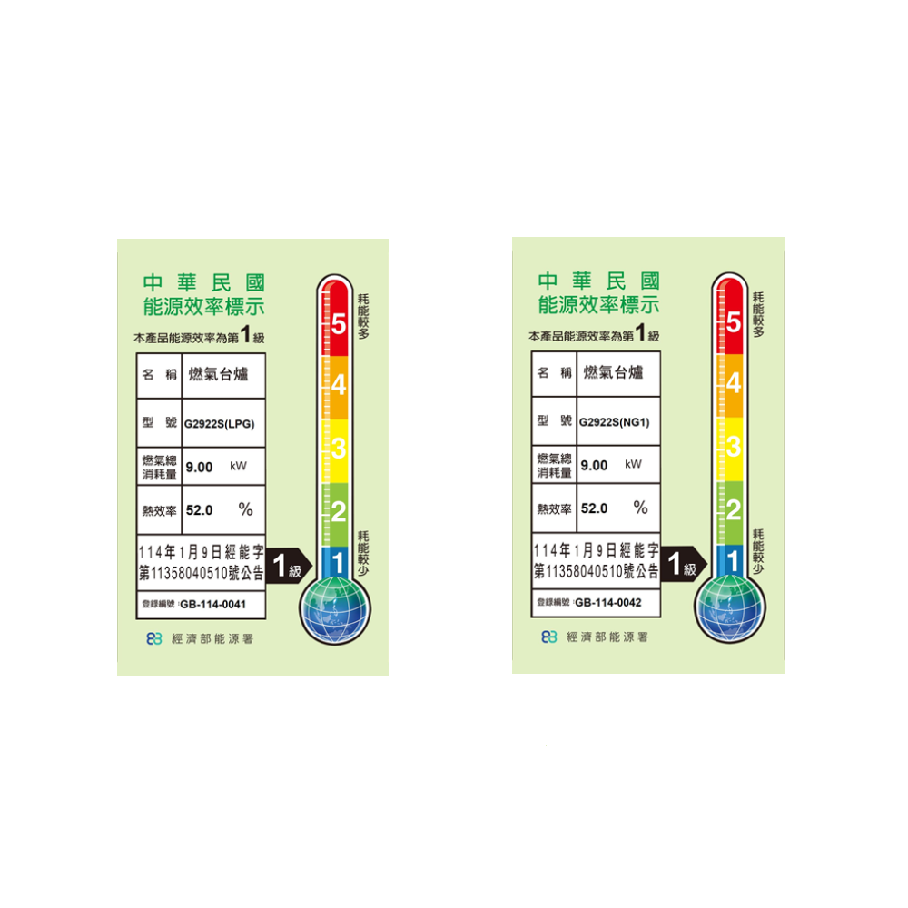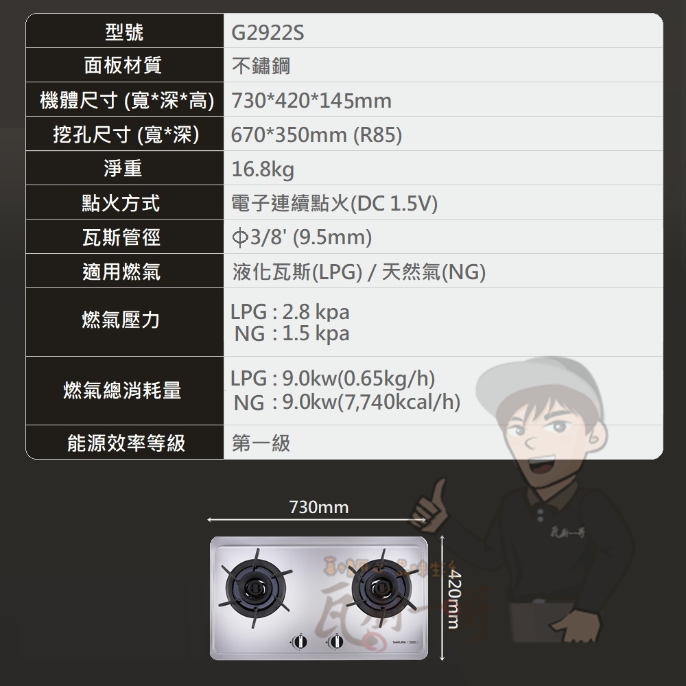 LPG共9.0kW (0.65 kg/h) / NG共9.0kW (7,740 kcal/h)