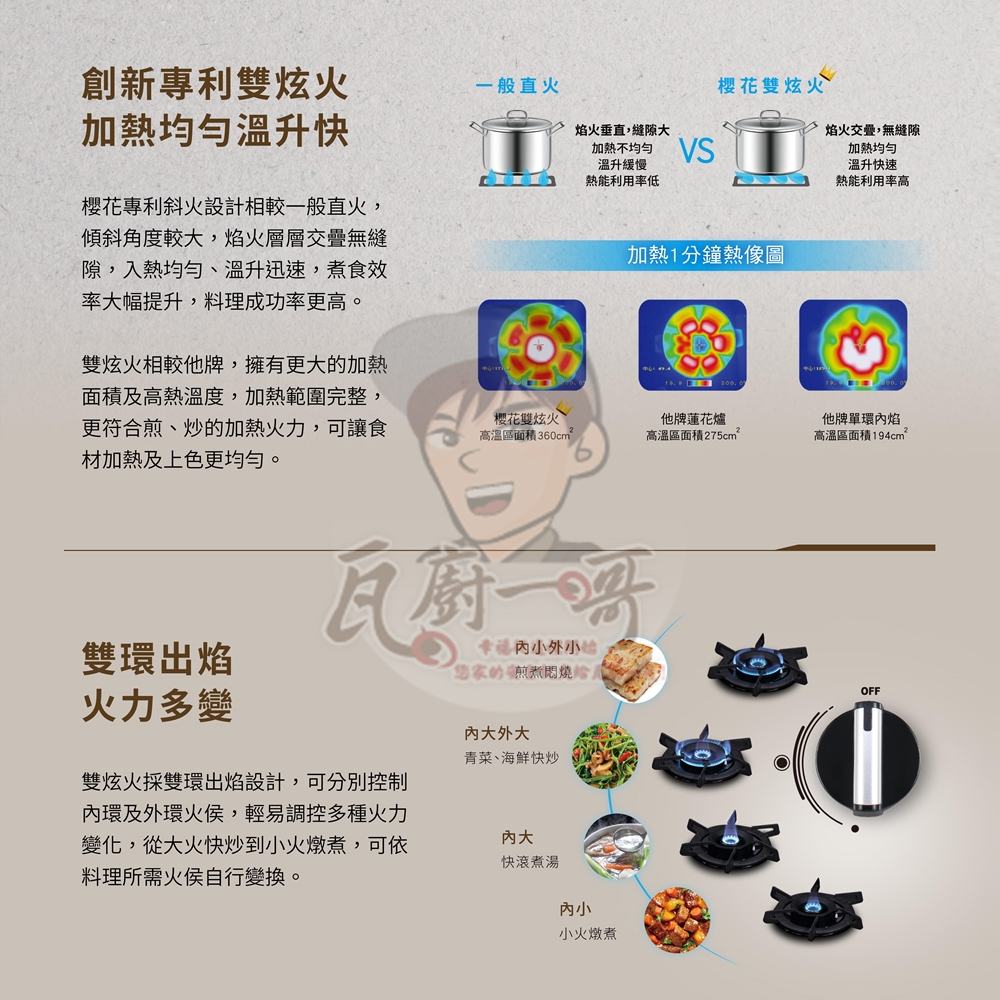 - 內外雙環獨立控火,大火文火隨心所欲