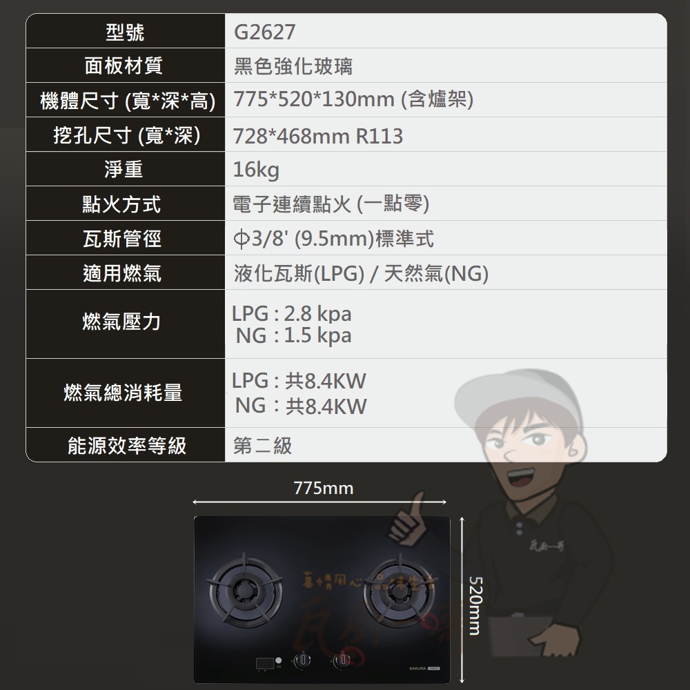 (含爐架) 775 x 520 x 130 mm