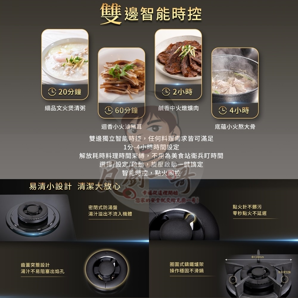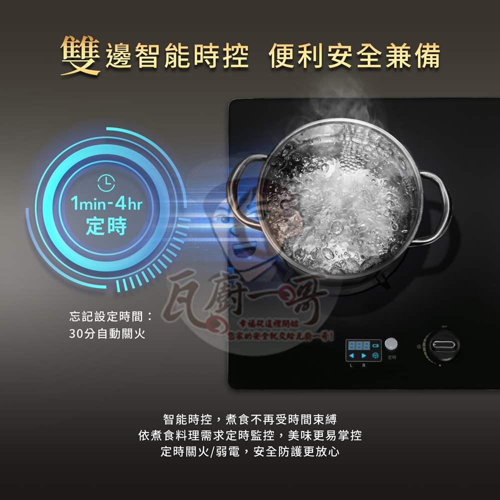 - 雙爐獨立智能時控,1分-4小時定時關火