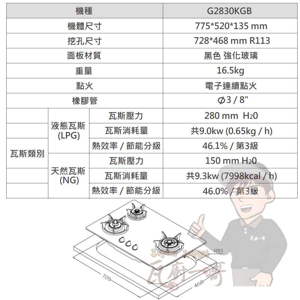 G2830KG 三口防乾燒節能檯面爐