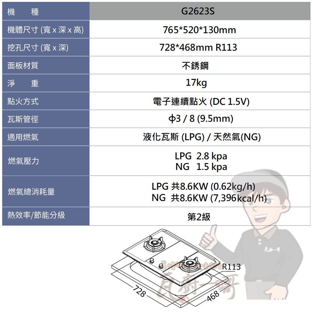 LPG共8.6kW (0.62 kg/h) / NG共8.6kW (7,396 kcal/h)